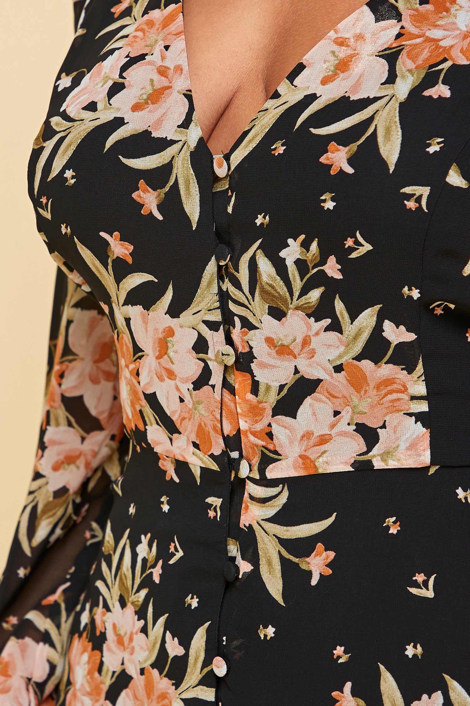 This floral long sleeve midi dress features a ruffled hi-lo hem, puffed sleeves, and a button closure in front.