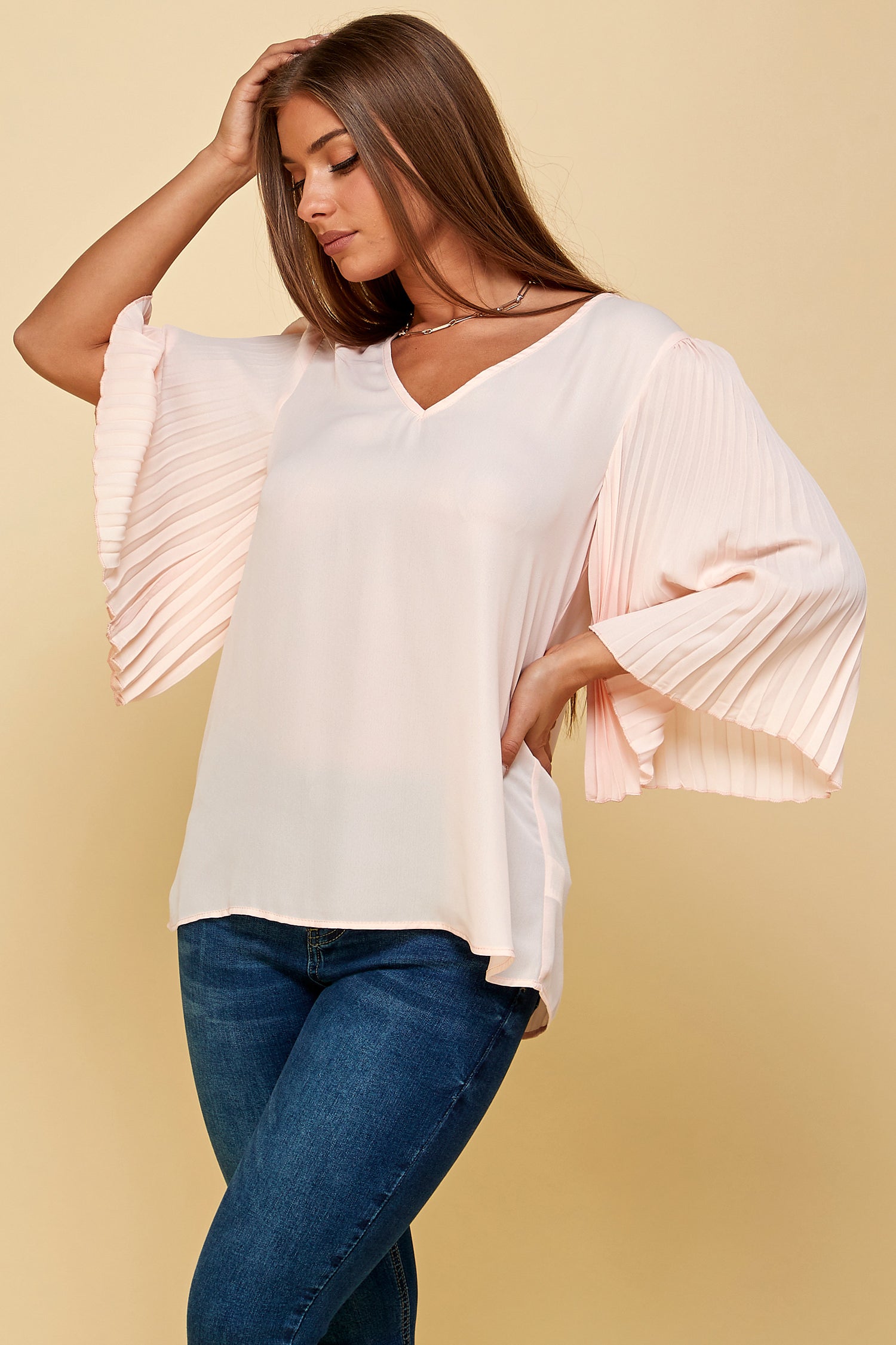 This long sleeve tunic top features a v-neck in the front and contrast pleated dolman sleeves.