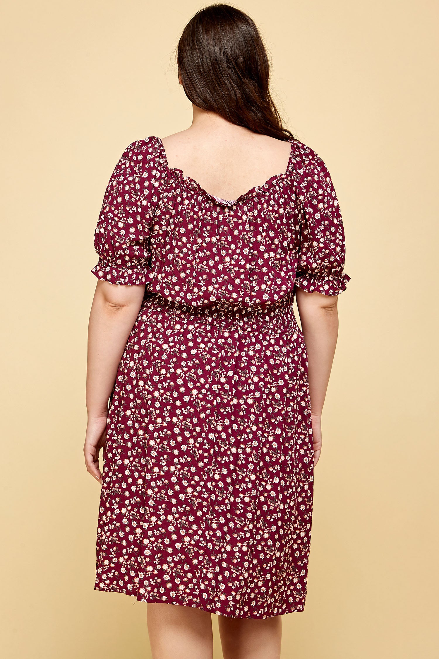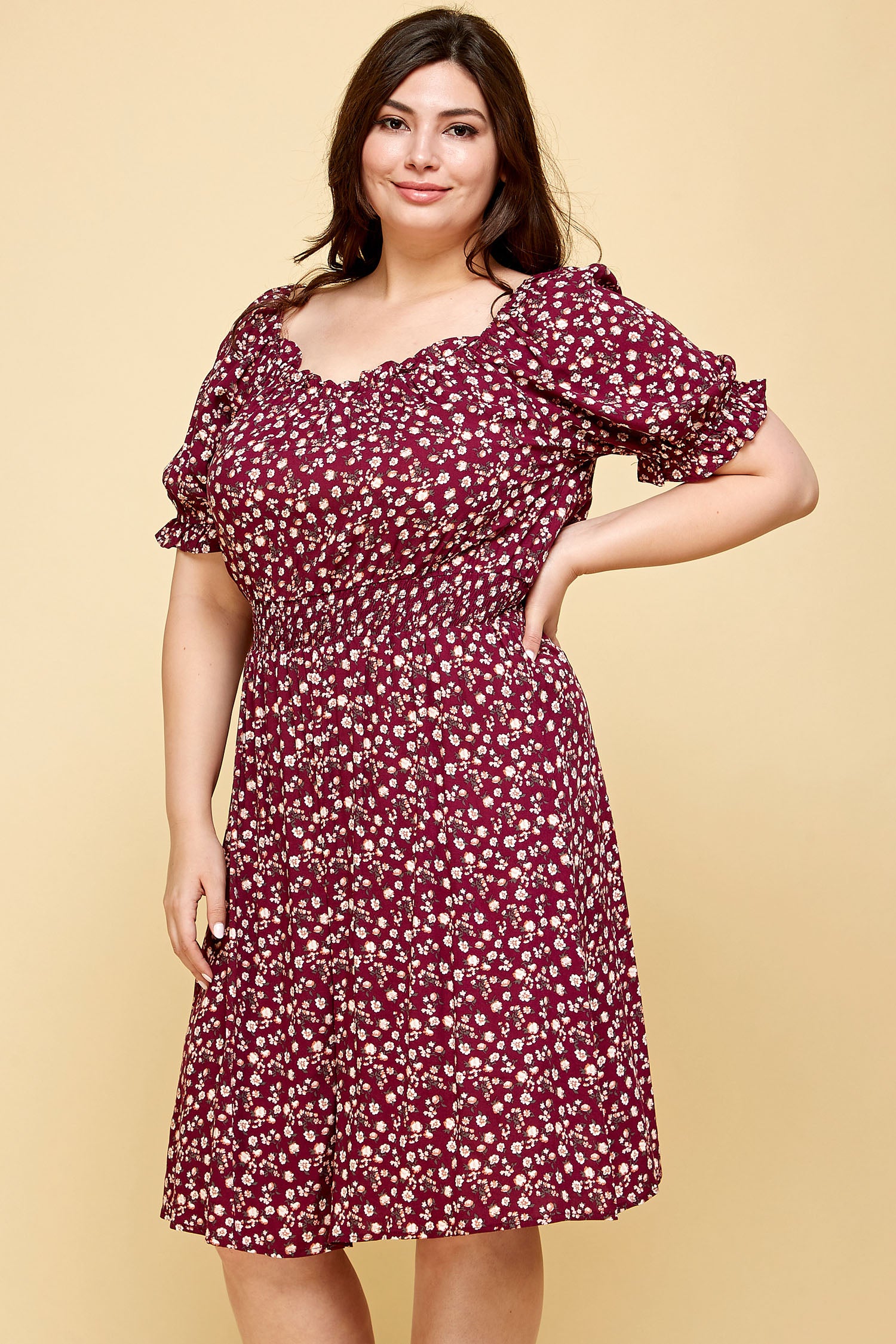 This smocked floral dress features elastic 1/2 sleeves, a ruffled hem on the shoulders and falls just below the knees.